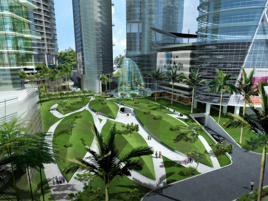 The development encompasses commercial office, retail, and residential spaces on a 9.1-acre land, with up to 2 acres designated as a green lung and centerpiece park. The buildings are strategically oriented to consider the sun path and maximize views of the city and the green mountain range. The curved massing creates a more organic layout, addressing void spaces between buildings and transforming them into a common linear garden that links the structures.